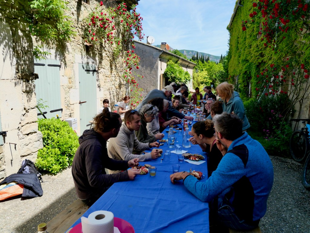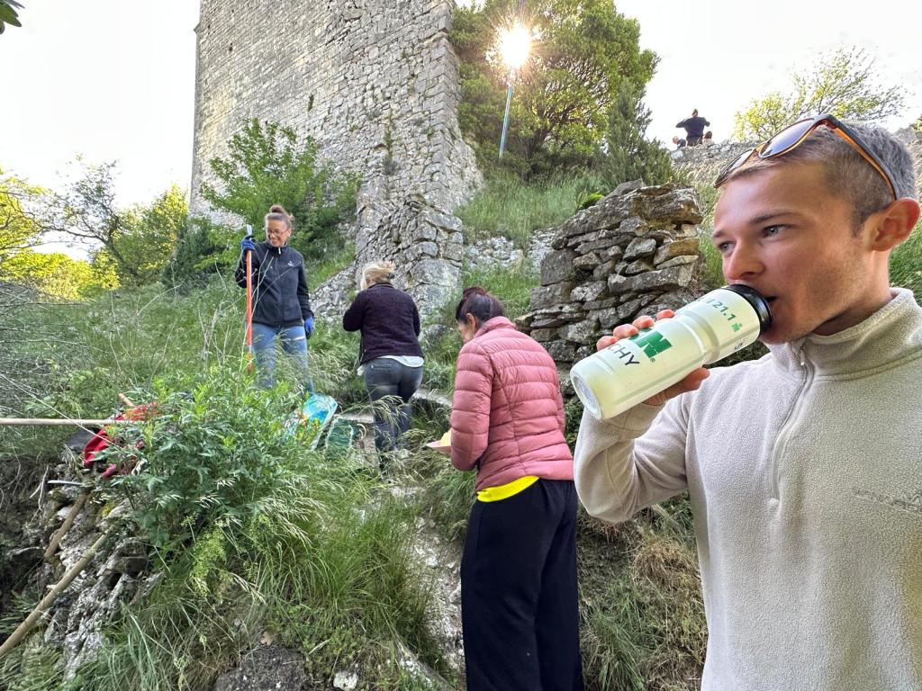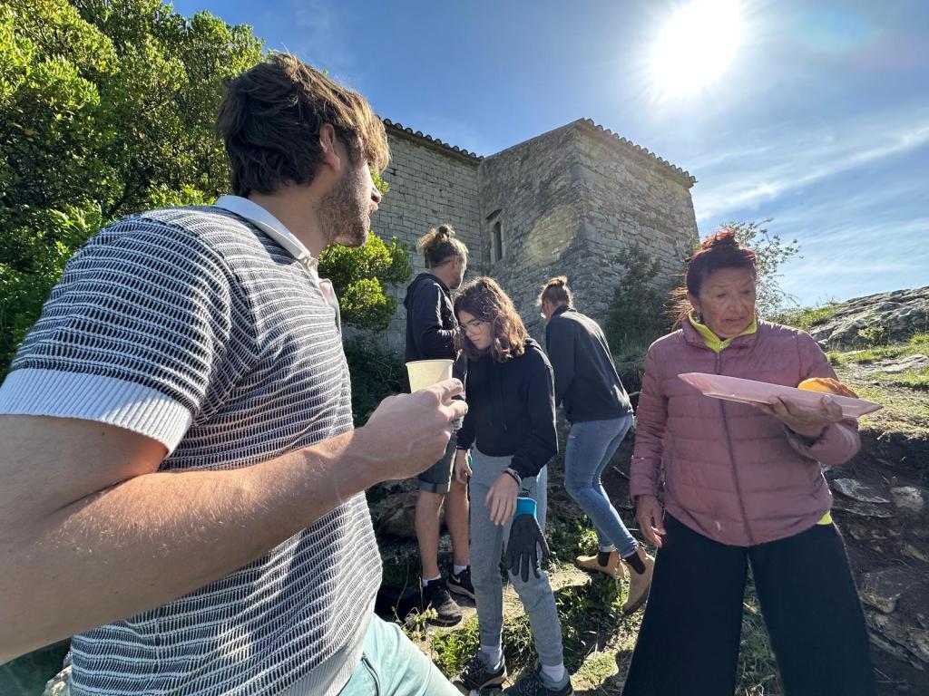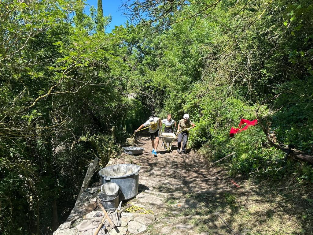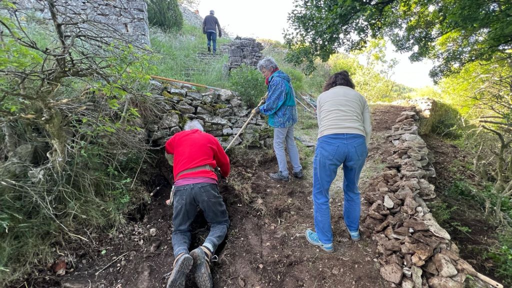 Un petit café et au travail ! Constitution des équipes : d’un côté une quinzaine de maçons et ramasseurs de pierres pour réparer les brèches dans le mur de soutènement de la calade et de l’autre autant de jardiniers qui avaient pour tache de dégager la végétation et la terre pour retrouver la calade d’origine.